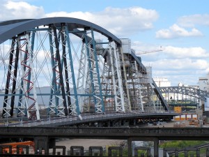 Ebenso interessant ist darüber hinaus, dass sich in der unmittelbaren Umgebung der EZB auch so einiges tut. So wurden beispielsweise an der Ostseite einige neue Straßen angelegt bezw. verbreitert und ausgebaut. Außerdem entsteht hier die neue Mainbrücke Ost, deren markanten Bögen sind bereits gut zu erkennen. Die Brücke, die zurzeit auf dem Gelände östlich der Deutschherrnbrücke und des zukünftigen Hafenparks entsteht, ist bald fertig.