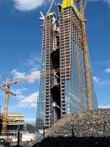 Es passiert was im Osten von Frankfurt und es wächst und wächst und wächst. Wie ich bereits an dieser Stelle berichtet hatte, strebt die EZB immer weiter in den Himmel und müsste jetzt in Kürze ihre endgültige Höhe von ca. 185m erreicht haben. Unübersehbar in Frankfurt ist mittlerweile der Bau mit seiner charakter­istischen Form. Die Glasfront ist zu einem Teil bereits fertig­gestellt. Die Spiegelung der Wolken an den großen Glas­flächen sind gut zu erkennen und ich denke, die EZB hat das Zeug ein neues Wahrzeichen von Frankfurt zu werden.